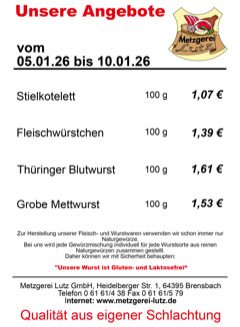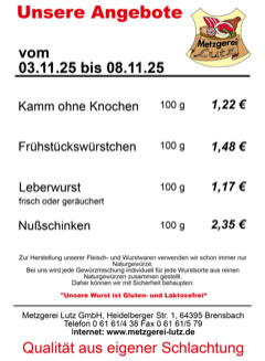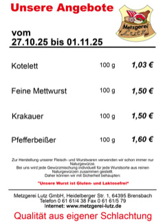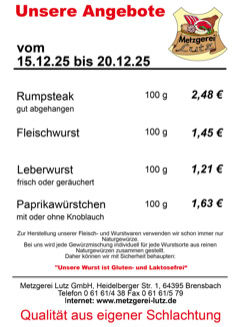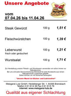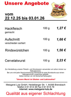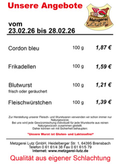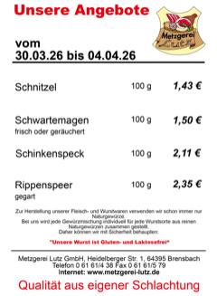 Metzgerei Lutz GmbH - Heidelberger Str. 1 - 64395 Brensbach - Telefon: 06161-438 Fax: 06161-579 - email: verkauf@metzgerei-lutz.de - info@metzgerei-lutz.de