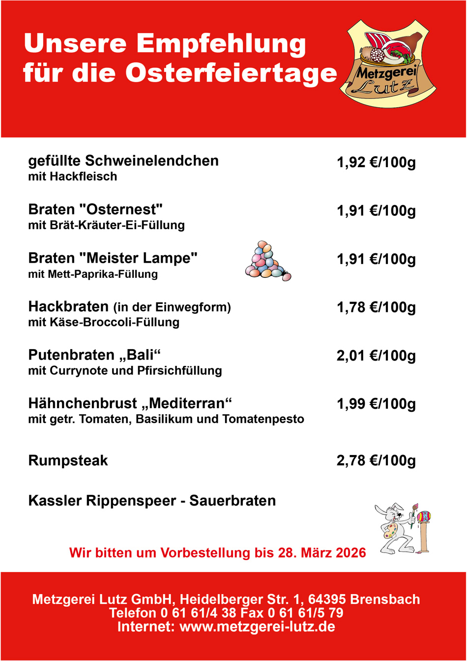 Metzgerei Lutz GmbH - Heidelberger Str. 1 -  64395 Brensbach - Telefon: 06161-438  Fax: 06161-579 - email: verkauf@metzgerei-lutz.de - info@metzgerei-lutz.de